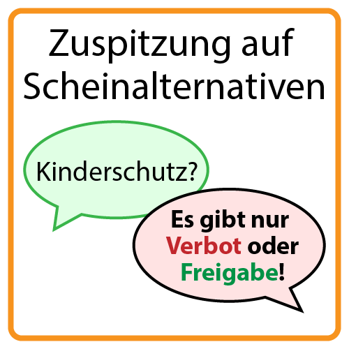 Manchmal wird versucht, eine aufkommende Diskussion sofort auf die Scheinalternativen "Freigabe oder Verbot" zu verengen, um dann wiederum ein "Verbot" als Diskriminierung anprangern zu können. Doch eine solche Zuspitzung ist unzulässig, denn zwischen diesen Positionen gibt es viele weitere Optionen. So kann man beispielsweise: